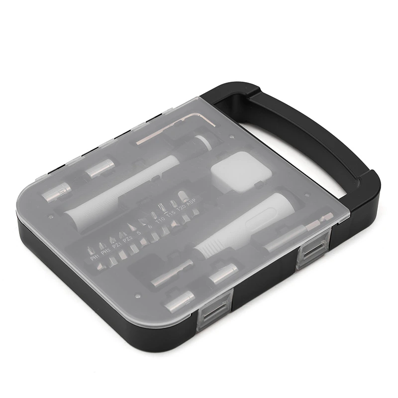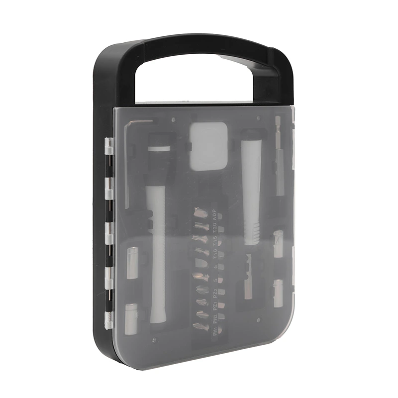 Set de herramientas, con en maletin de tapa transparente. Incluye: Llave allen, linterna, metro extensible, destornillador de puntas intercambiables. Medidas: 22 x 16 x 2,7 cm.