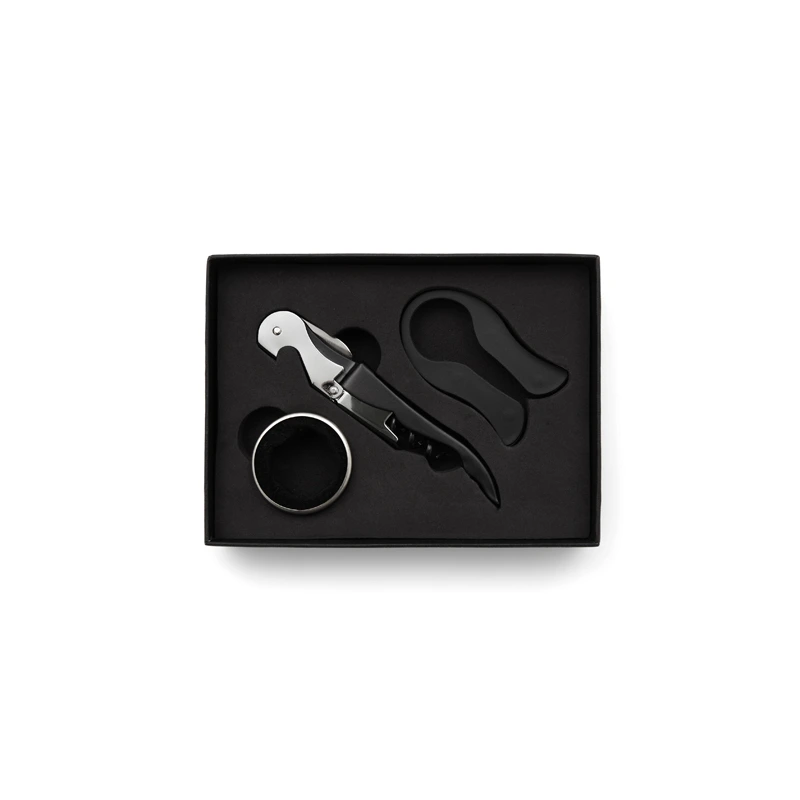 Set de accesorios de 3 piezas que necesitas para disfrutar mejor de tu vino. Incluye sacacorchos en dos tiempos, anillo cortagotas, y corta sello. Viene presentado en una caja negra de 13 x 15 cm. Ideal para hacer un regalo original y práctico a un amigo o familiar.